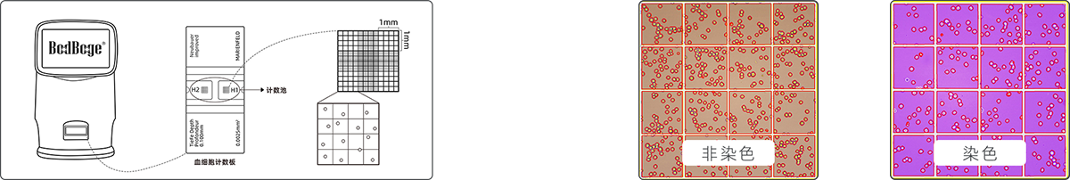 儀器內置高倍數光學放大系統+千萬級彩色相機,讓細胞成像更清晰,可實時預覽細胞圖像;儀器參照“JJG 522-1988 血細胞計數板試行檢定規程”設計,實現血細胞計數板上機自動操作,濃度計算公式=(四個大方格細胞數之和)/4×104 (個細胞/mL),可人工復核計數結果。